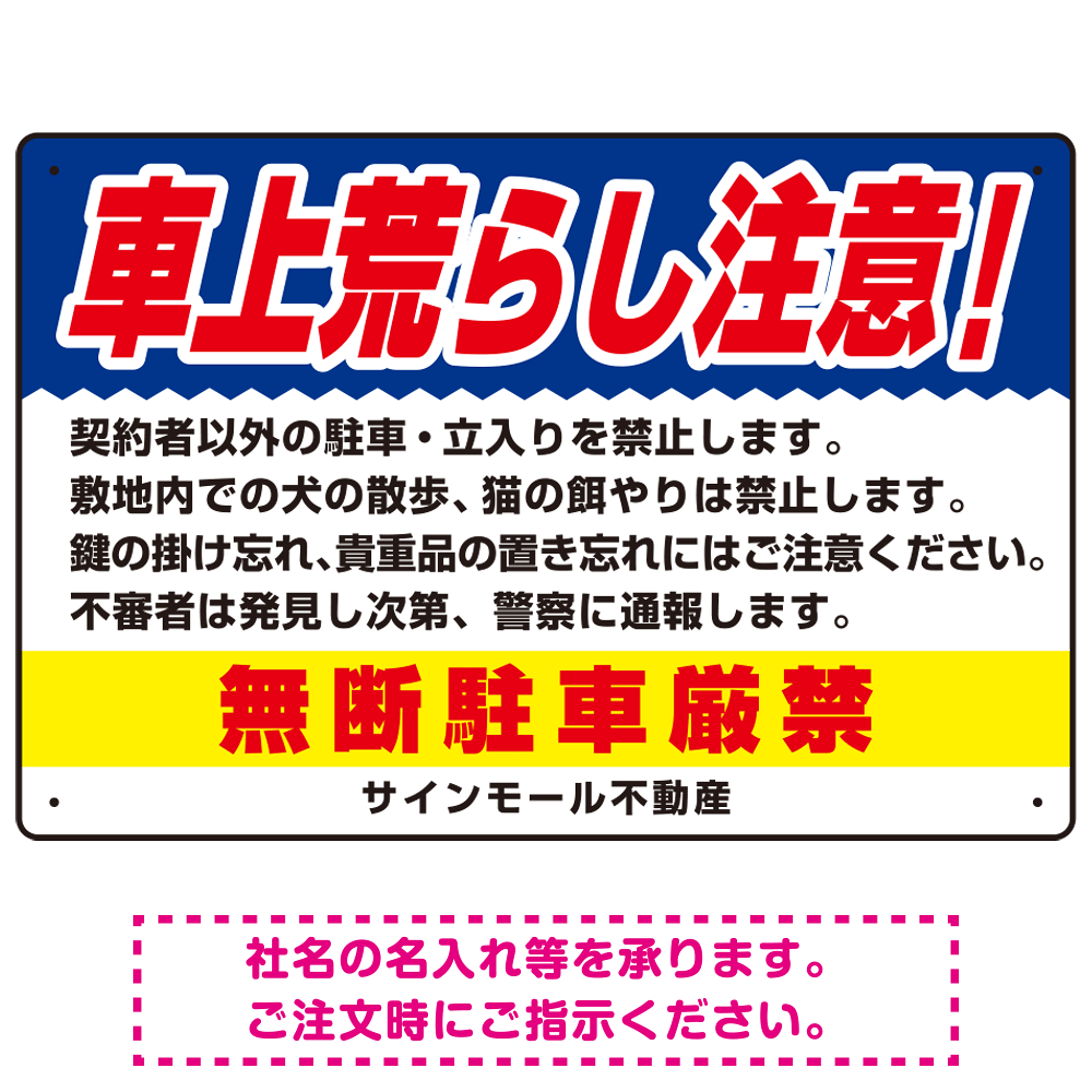 車上荒らし注意 無断駐車厳禁 駐車場注意看板 オリジナル プレート看板 ブルー W450×H300 エコユニボード (SP-SMD672B-45x30U)
