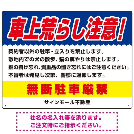 車上荒らし注意 無断駐車厳禁 駐車場注意看板 オリジナル プレート看板 ブルー W600×H450 エコユニボード (SP-SMD672B-60x45U)
