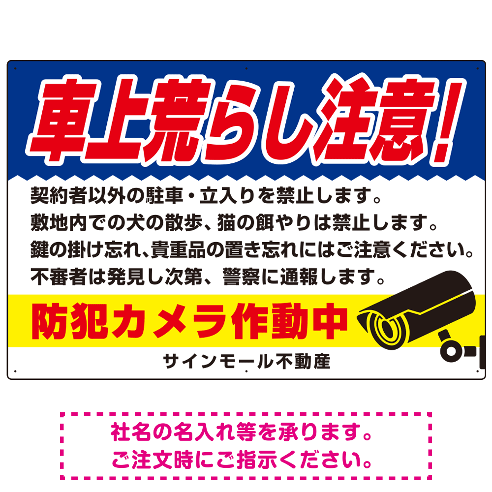商品説明:車上荒らし注意 防犯カメラ作動中 駐車場注意看板 オリジナル プレート看板 ブルー W900×H600 エコユニボード (SP-SMD673B-90x60U)