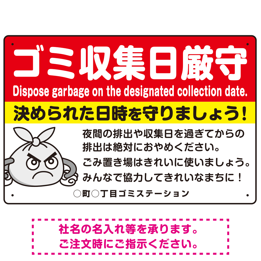 ゴミ収集日厳守 決められた日時を守りましょう オリジナル プレート看板 レッド W450×H300 エコユニボード (SP-SMD619A-45x30U)