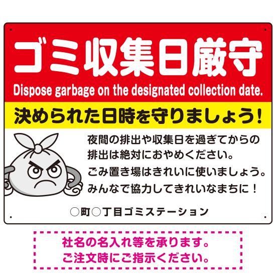 ゴミ収集日厳守 決められた日時を守りましょう オリジナル プレート看板 レッド W600×H450 エコユニボード (SP-SMD619A-60x45U)