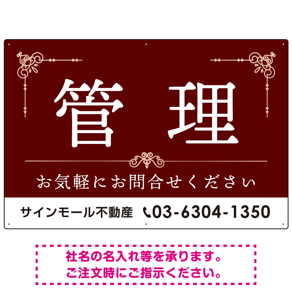 よくある質問:不動産向け 管理 飾り罫付デザイン オリジナル プレート看板 レッド W900×H600 エコユニボード (SP-SMD674A-90x60U)
