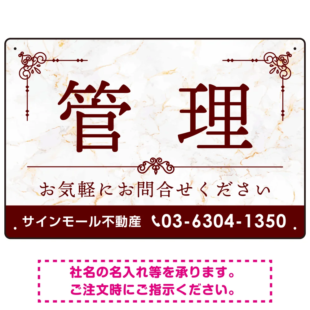 大理石調 飾り罫付き 管理 不動産向けデザイン オリジナルプレート看板 レッド W450×H300 マグネットシート (SP-SMD675A-45x30M) の商品詳細