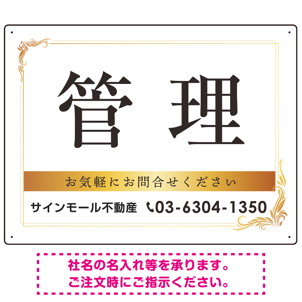 「管理 ゴールデン飾り罫付きデザイン オリジナルプレート看板 W600×H450 マグネットシート (SP-SMD677-60x45M)」の導入をご検討中ですか? 大量注文・複数台のご検討に応じたお見積りのご相談、最短納期や送料、仕様・サイズの確認など、 管理物件用プレート看板選びをまとめてサポートいたします。