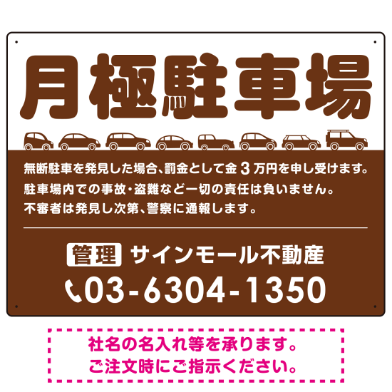 商品説明:月極駐車場 車が並ぶイラスト付デザイン オリジナル プレート看板 ブラウン W600×H450 エコユニボード (SP-SMD679C-60x45U)