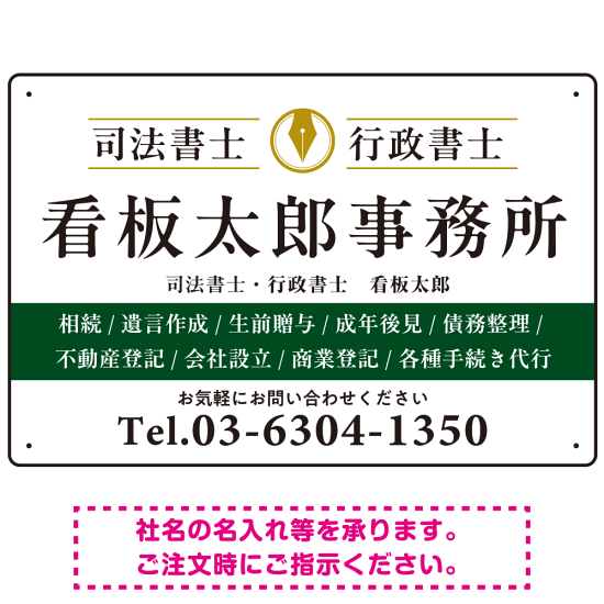 端正な印象のスッキリデザイン 行政書士・司法書士事務所向けプレート看板 プレート看板 グリーン W450×H300 アルミ複合板 (SP-SMD681B-45x30A)