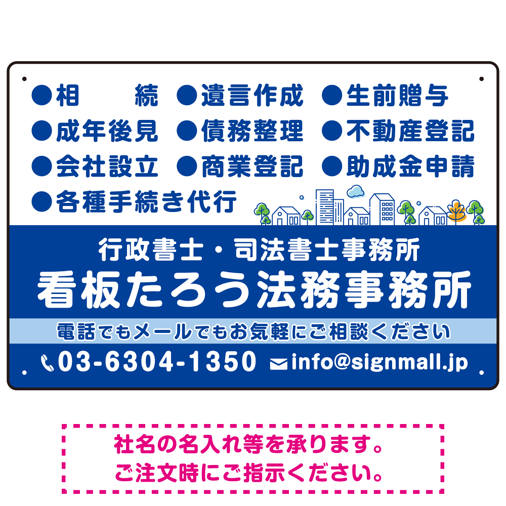 業務内容が見やすく町並みイラストが優しい印象を与えるSP-SMD682シリーズ行政書士・司法書士事務所向けデザインプレート看板