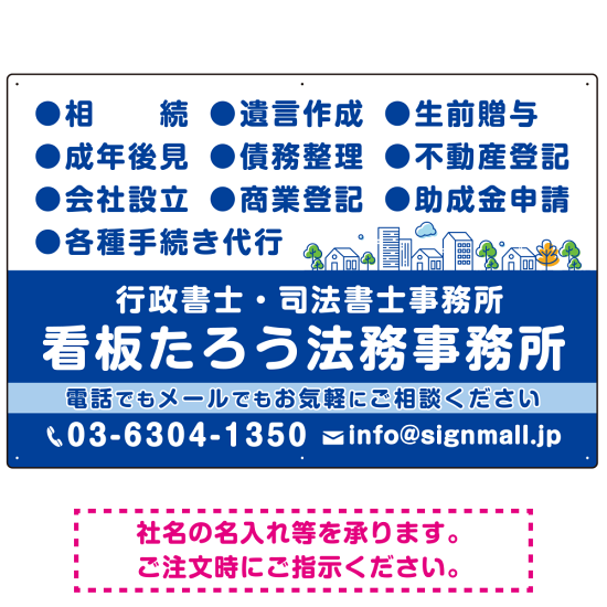視認性抜群の業務内容配置とワンポイント町並みデザイン 行政書士・司法書士事務所向けプレート看板 プレート看板 ブルー W900×H600 エコユニボード (SP-SMD682A-90x60U)