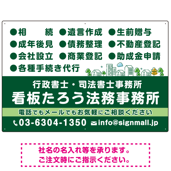 視認性抜群の業務内容配置とワンポイント町並みデザイン 行政書士・司法書士事務所向けプレート看板 プレート看板 グリーン W900×H600 エコユニボード (SP-SMD682B-90x60U)