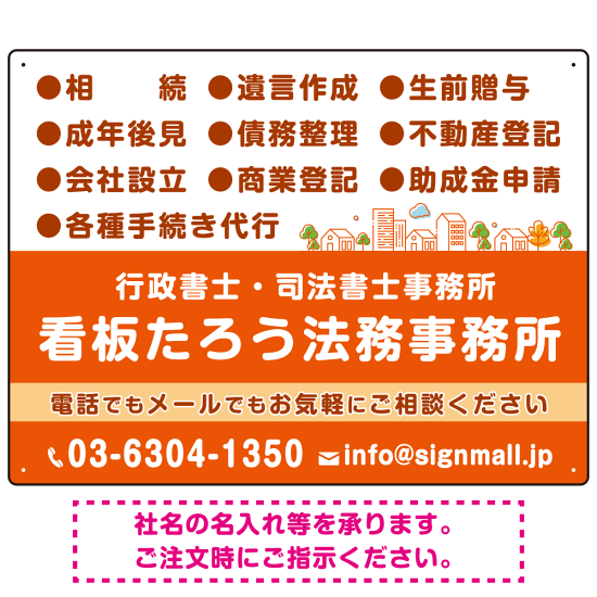 視認性抜群の業務内容配置とワンポイント町並みデザイン 行政書士・司法書士事務所向けプレート看板 プレート看板 オレンジ色 W600×H450 エコユニボード (SP-SMD682C-60x45U)