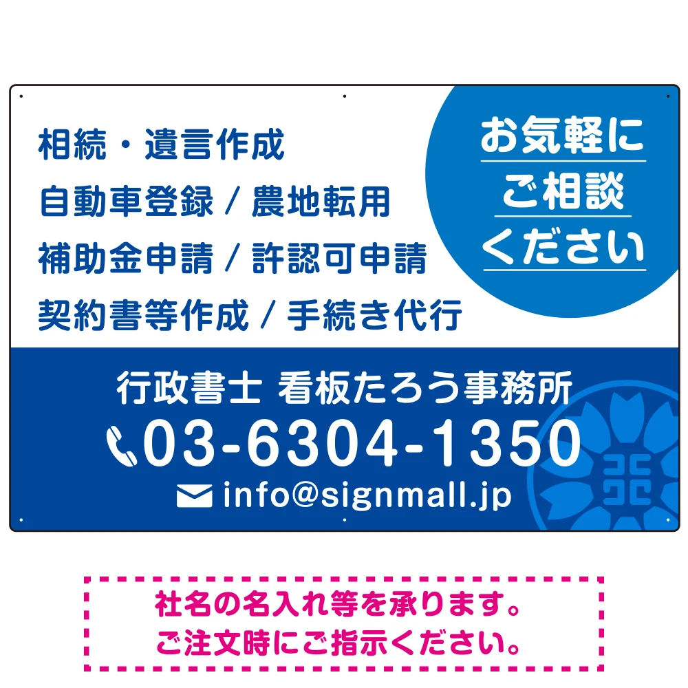 ご相談を促す丸型アクセント付きデザイン 行政書士・司法書士事務所向けプレート看板 プレート看板 ブルー W900×H600 エコユニボード (SP-SMD684A-90x60U)