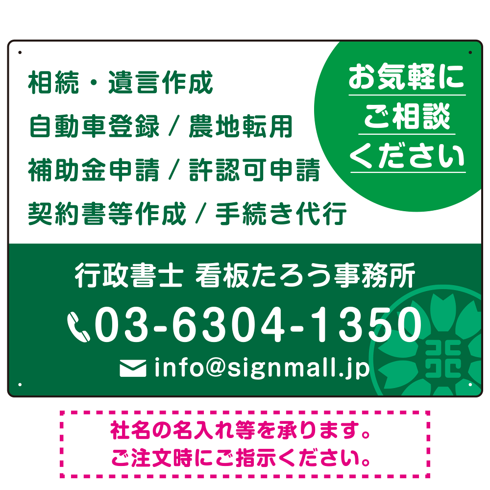 ご相談を促す丸型アクセント付きデザイン 行政書士・司法書士事務所向けプレート看板 プレート看板 グリーン W600×H450 エコユニボード (SP-SMD684B-60x45U)