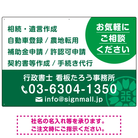 ご相談を促す丸型アクセント付きデザイン 行政書士・司法書士事務所向けプレート看板 プレート看板 グリーン W900×H600 エコユニボード (SP-SMD684B-90x60U)
