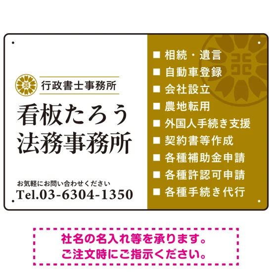 よくある質問:左右分割のスタイリッシュデザイン 行政書士・司法書士事務所向けプレート看板 プレート看板 山吹色 W450×H300 エコユニボード(SP-SMD685C-45x30U)