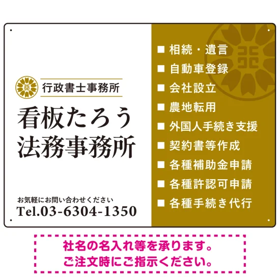 左右分割のスタイリッシュデザイン 行政書士・司法書士事務所向けプレート看板 プレート看板 山吹色 W600×H450 エコユニボード(SP-SMD685C-60x45U)