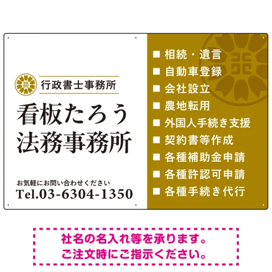 左右分割のスタイリッシュデザイン 行政書士・司法書士事務所向けプレート看板 プレート看板 山吹色 W900×H600 マグネットシート(SP-SMD685C-90x60M)