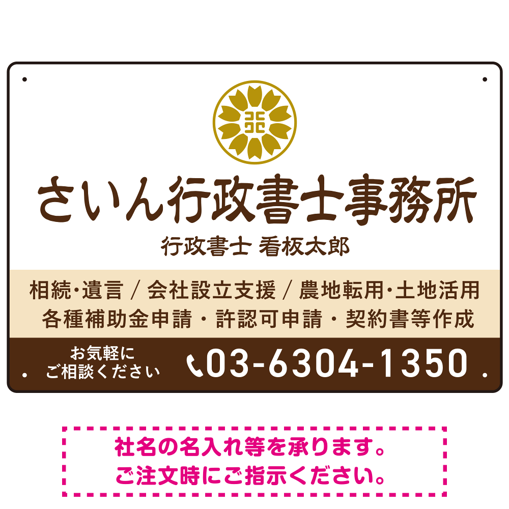隷書体で品格と伝統を感じさせるスッキリデザイン 行政書士・司法書士事務所向けプレート看板 プレート看板 ブラウン W450×H300 エコユニボード(SP-SMD686C-45x30U)