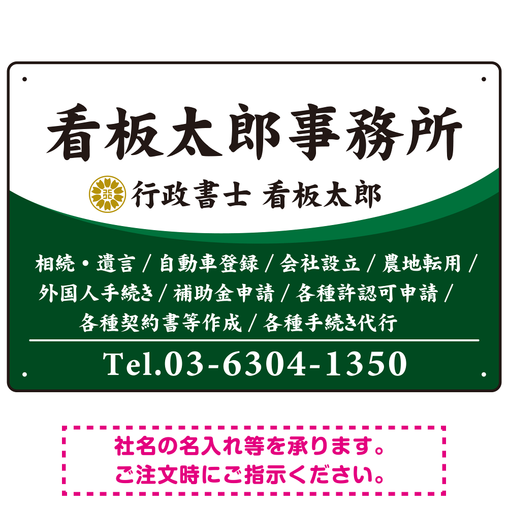 白文字の業務内容が映えるオーバルデザイン 行政書士・司法書士事務所向けプレート看板 プレート看板 グリーン W450×H300 エコユニボード(SP-SMD687B-45x30U)