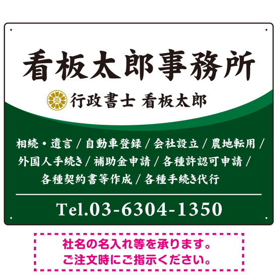 白文字の業務内容が映えるオーバルデザイン 行政書士・司法書士事務所向けプレート看板 プレート看板 グリーン W600×H450 エコユニボード(SP-SMD687B-60x45U)
