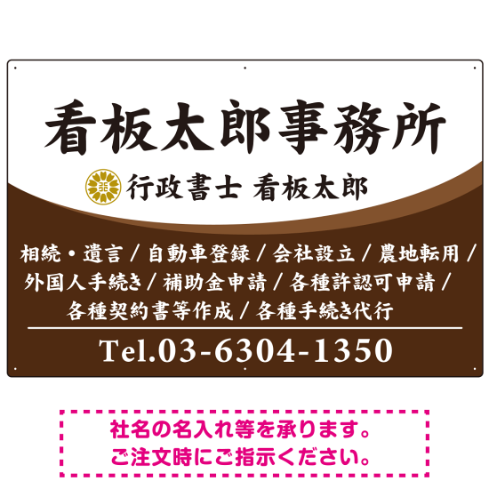 白文字の業務内容が映えるオーバルデザイン 行政書士・司法書士事務所向けプレート看板 プレート看板 ブラウン W900×H600 エコユニボード(SP-SMD687C-90x60U)