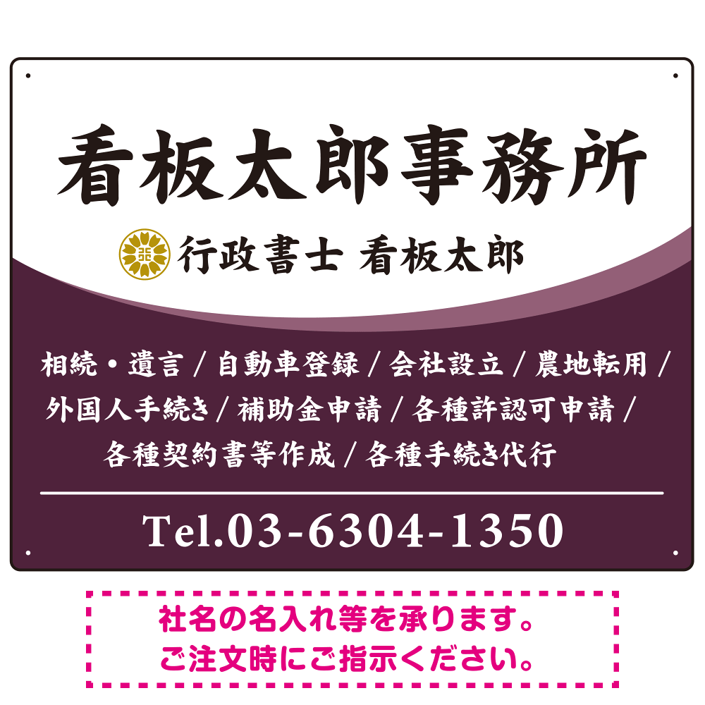 白文字の業務内容が映えるオーバルデザイン 行政書士・司法書士事務所向けプレート看板 プレート看板 パープル W600×H450 エコユニボード(SP-SMD687D-60x45U)