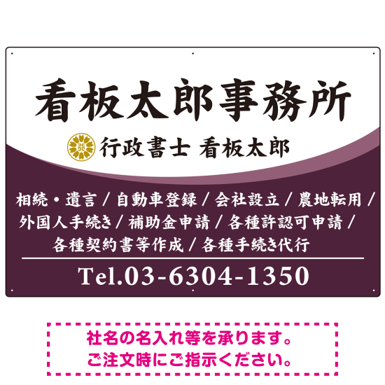 白文字の業務内容が映えるオーバルデザイン 行政書士・司法書士事務所向けプレート看板 プレート看板 パープル W900×H600 エコユニボード(SP-SMD687D-90x60U)