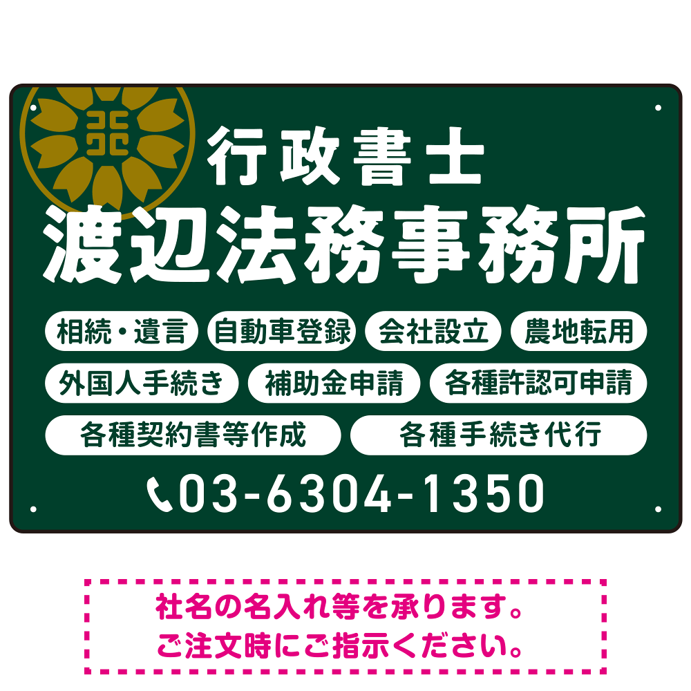 温かみのあるゴシック体で目を引く大胆デザイン 行政書士・司法書士事務所向けプレート看板 プレート看板 深緑色 W450×H300 エコユニボード(SP-SMD688B-45x30U)