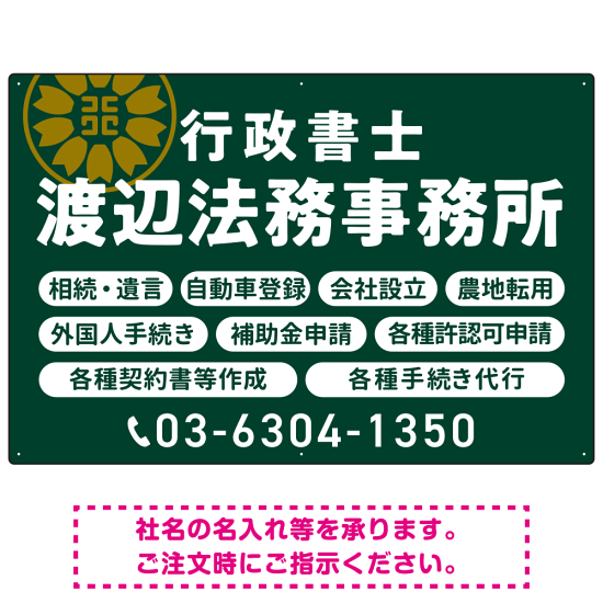 温かみのあるゴシック体で目を引く大胆デザイン 行政書士・司法書士事務所向けプレート看板 プレート看板 深緑色 W900×H600 エコユニボード(SP-SMD688B-90x60U)