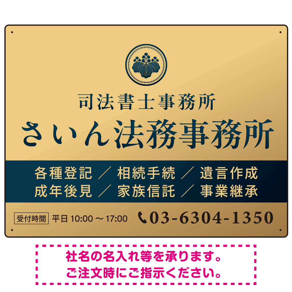 - ゴールドが印象的に映え、事務所の信頼感と存在感をしっかりと伝えます。