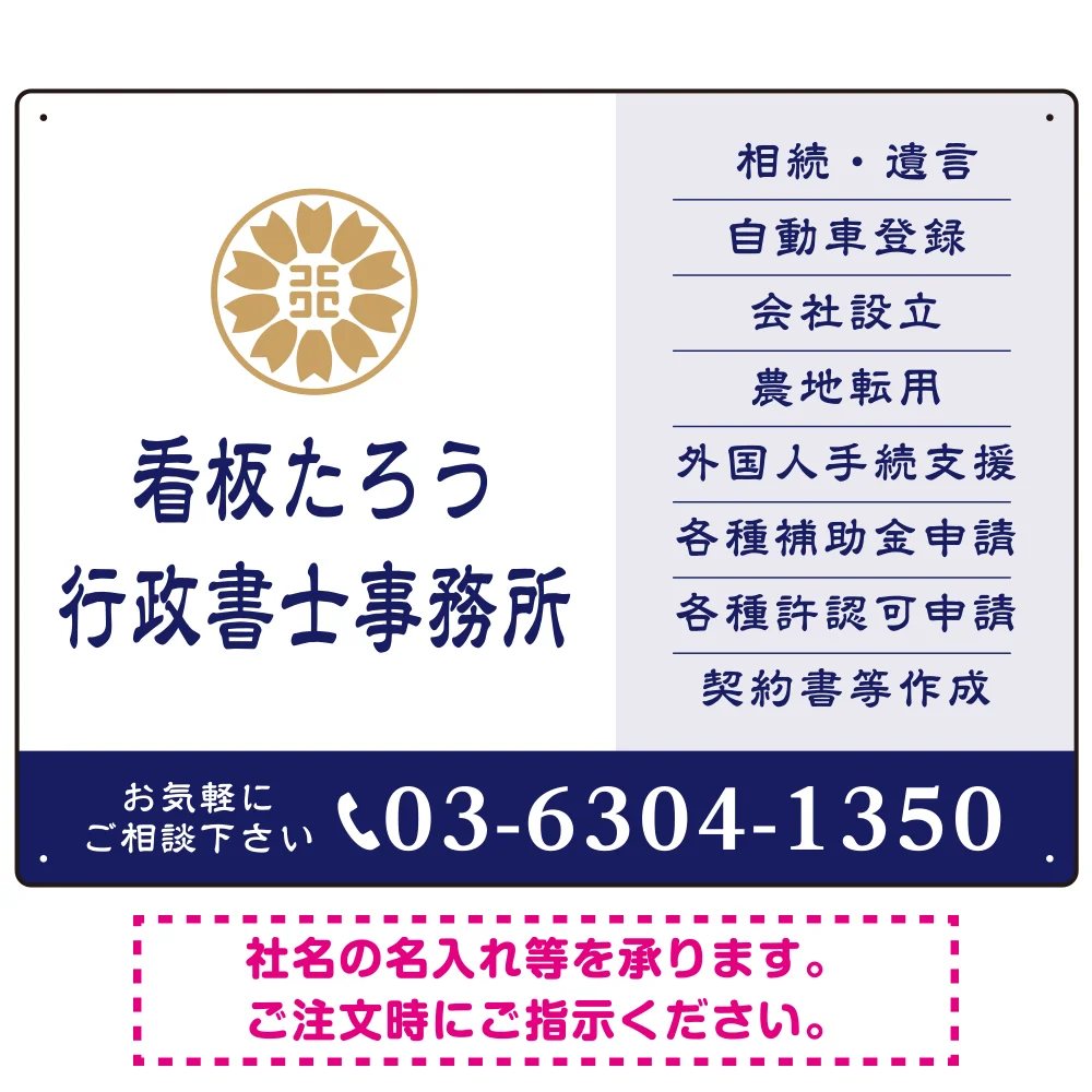よくある質問:左に事務所名を際立たせた隷書デザイン 行政書士・司法書士事務所向けプレート看板 プレート看板 ネイビー W600×H450 アルミ複合板(SP-SMD693A-60x45A)