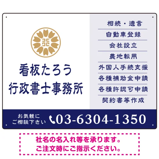 大きな事務所名と分かりやすい業務案内が特徴の行政書士・司法書士事務所向けデザインプレート看板