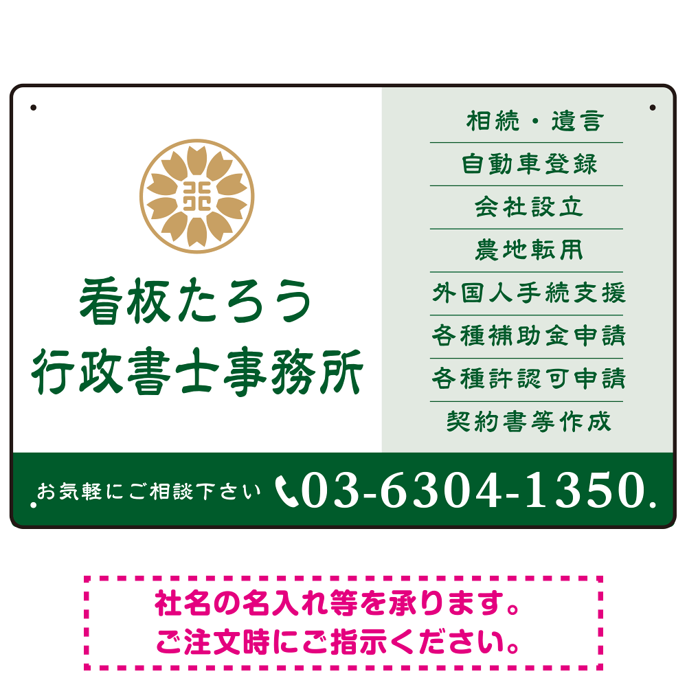 大きな事務所名と分かりやすい業務案内が特徴の行政書士・司法書士事務所向けデザインプレート看板