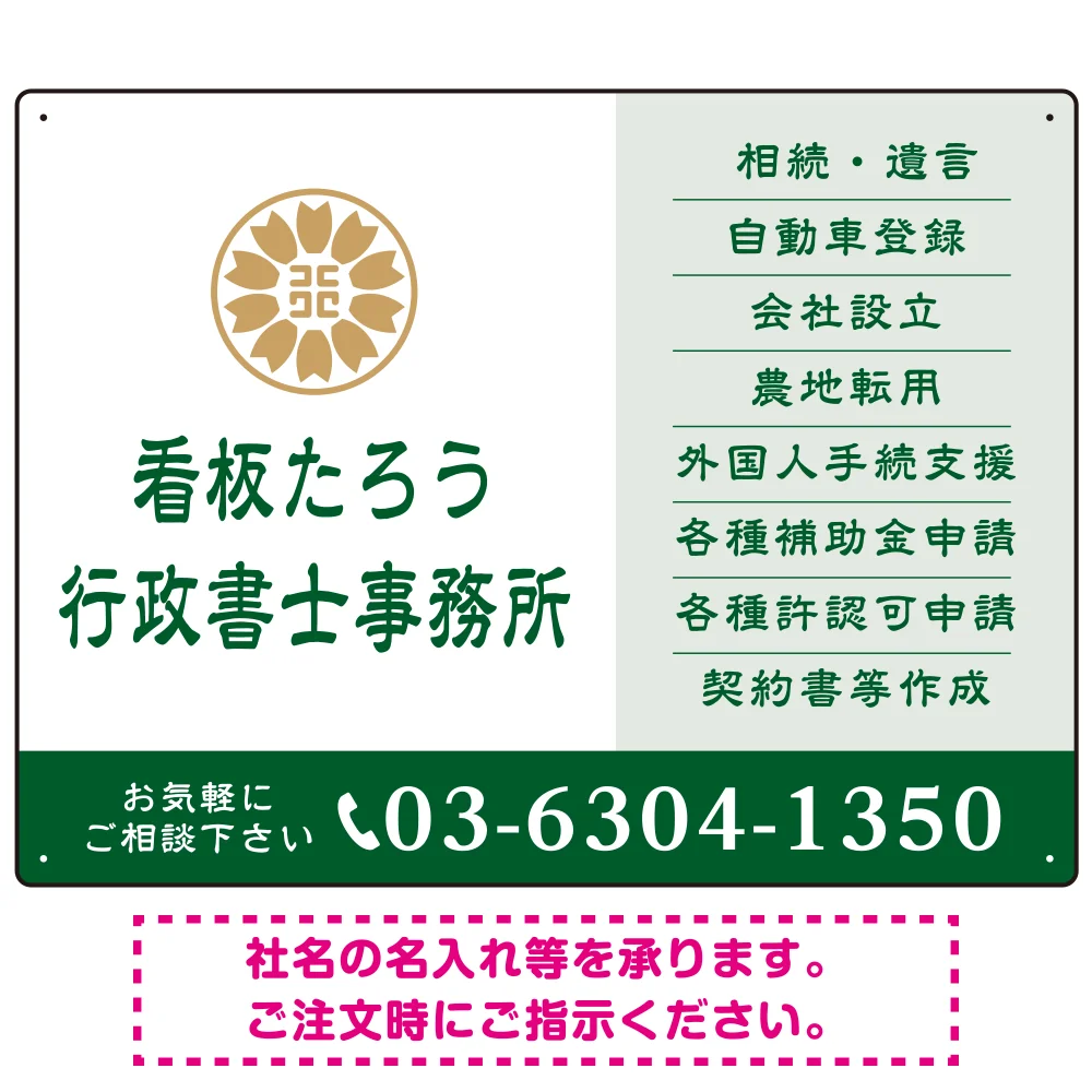 大きな事務所名と分かりやすい業務案内が特徴の行政書士・司法書士事務所向けデザインプレート看板