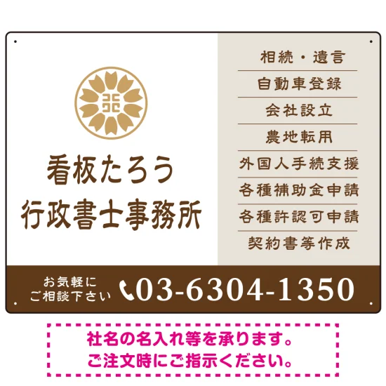 よくある質問:左に事務所名を際立たせた隷書デザイン 行政書士・司法書士事務所向けプレート看板 プレート看板 ブラウン W600×H450 アルミ複合板(SP-SMD693C-60x45A)
