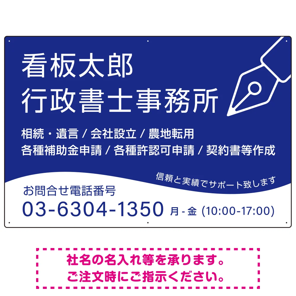 よくある質問:万年筆アイコンが印象的なデザイン 行政書士・司法書士事務所向けプレート看板 プレート看板 ブルー W900×H600 エコユニボード(SP-SMD695A-90x60U)