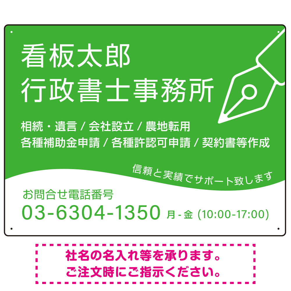 万年筆アイコンが印象的なデザイン 行政書士・司法書士事務所向けプレート看板 プレート看板 グリーン W600×H450 エコユニボード(SP-SMD695B-60x45U)