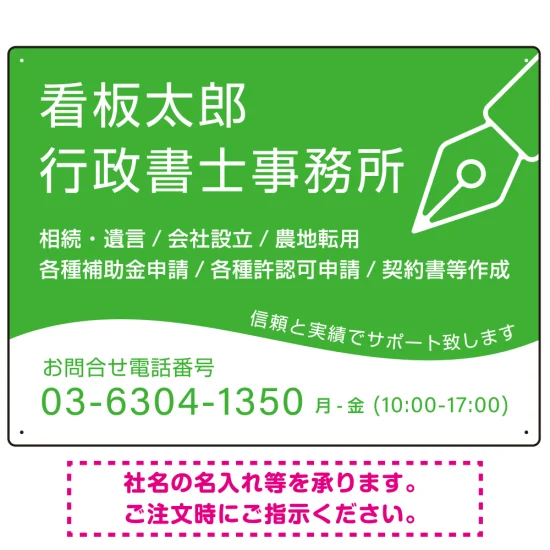 よくある質問:万年筆アイコンが印象的なデザイン 行政書士・司法書士事務所向けプレート看板 プレート看板 グリーン W600×H450 エコユニボード(SP-SMD695B-60x45U)