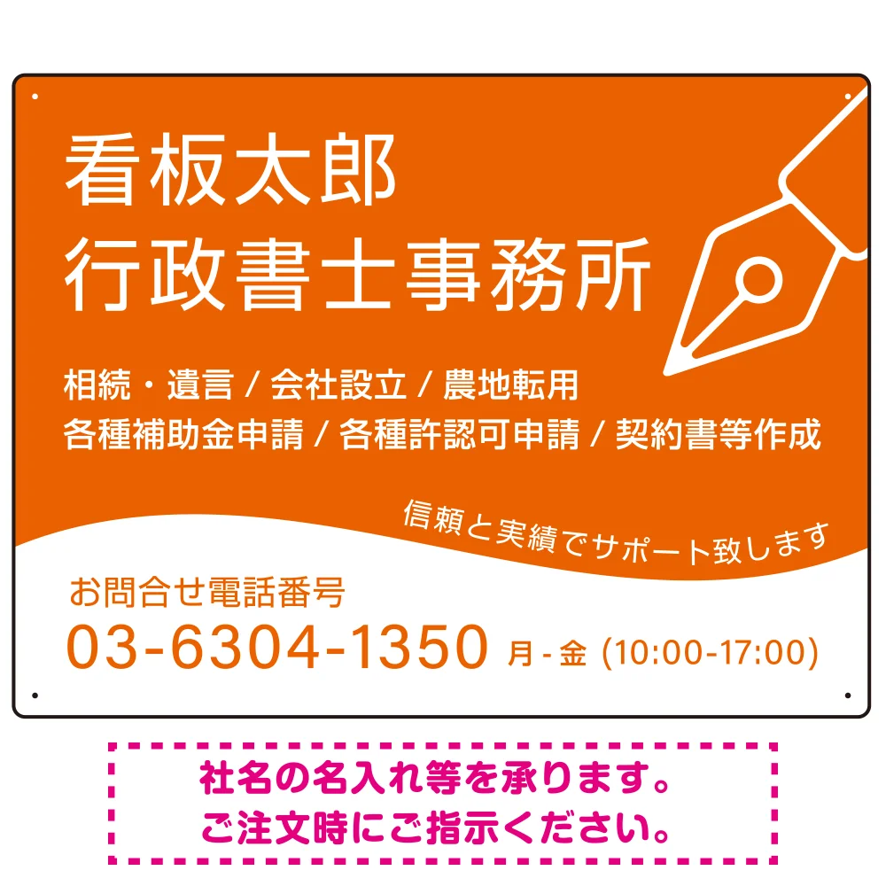 - 万年筆アイコンが印象的なデザイン 行政書士・司法書士事務所向けプレート看板 プレート看板 オレンジ色 W600×H450 マグネットシート(SP-SMD695C-60x45M)
