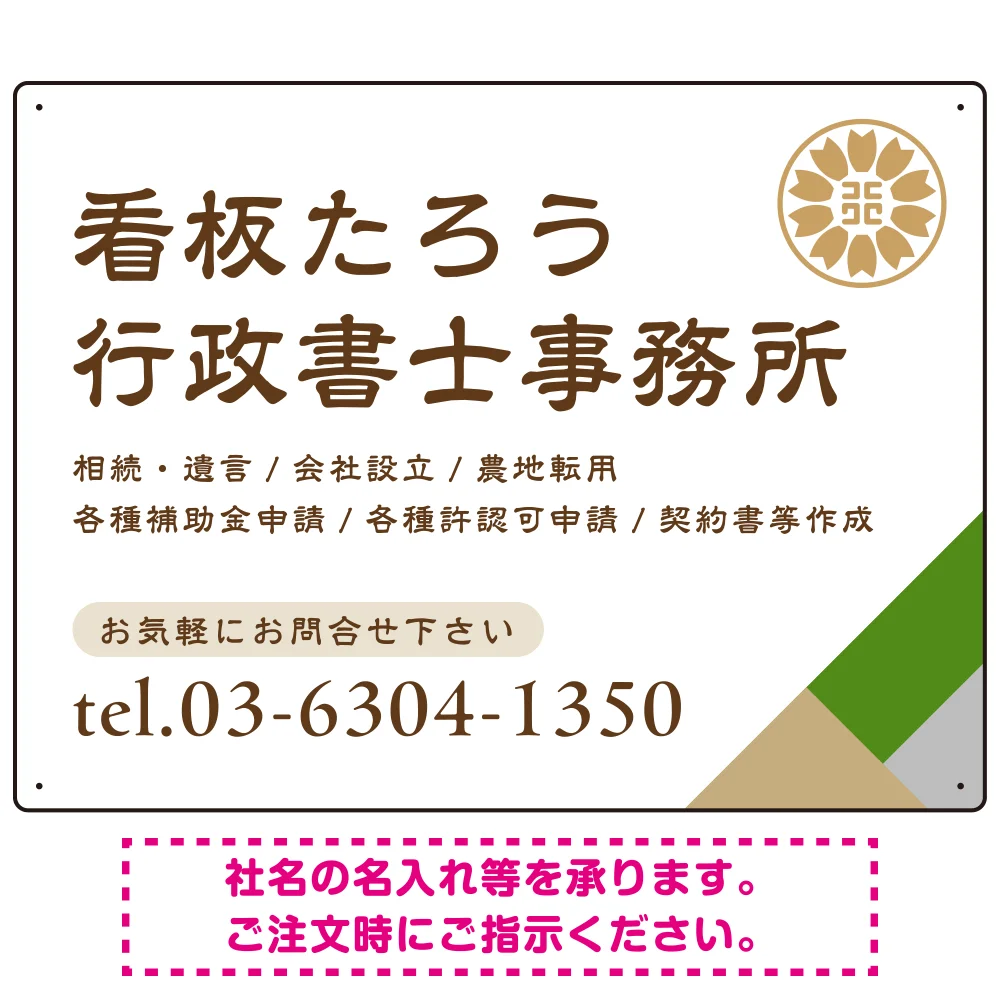 - 落ち着いた茶色の文字が安心感を与え、事務所の信頼感を引き立てます。