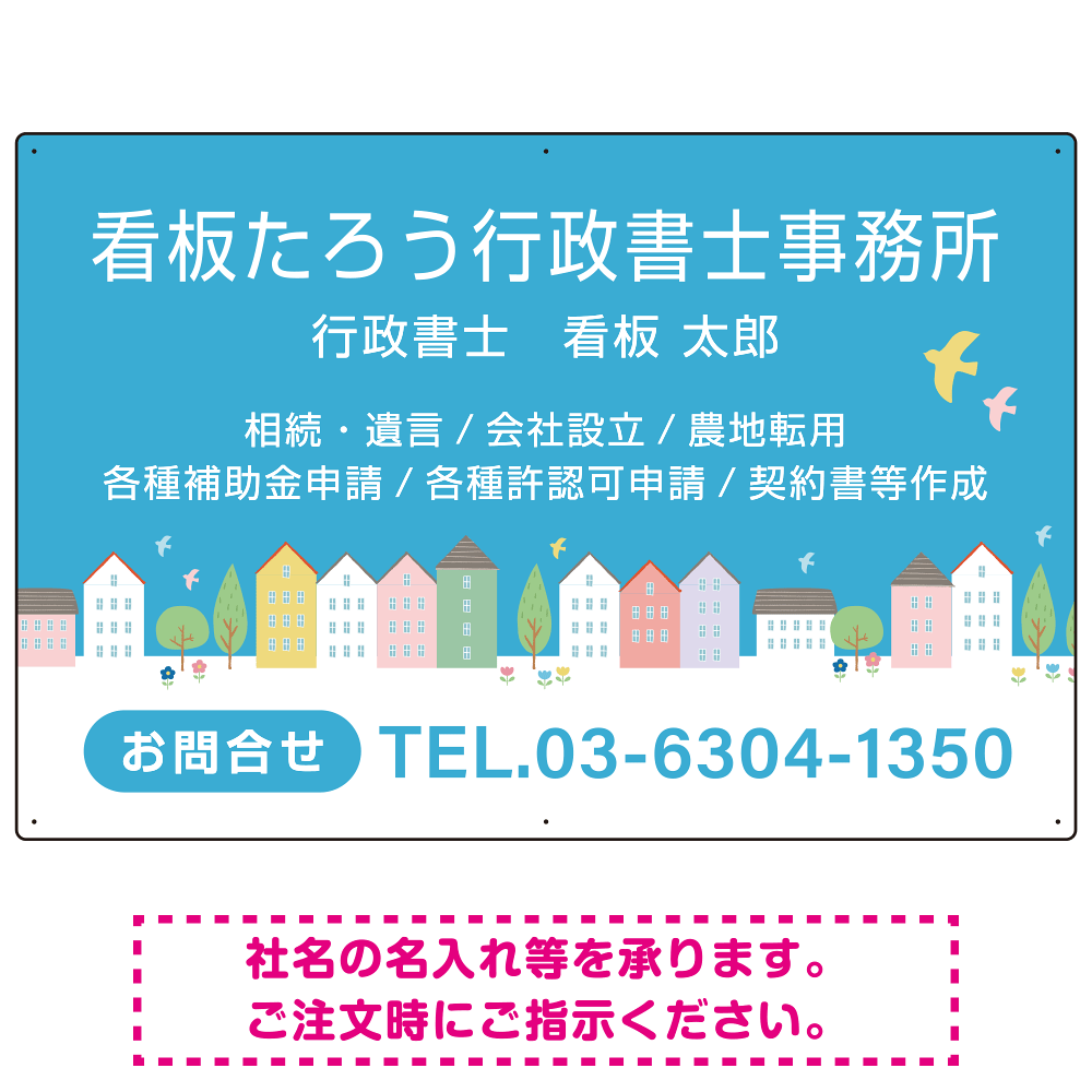 優しい青空と可愛らしい町並みが特徴の行政書士・司法書士事務所向けデザインプレート看板