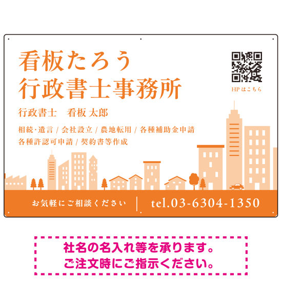 商品説明:シンプルモダンな街並みデザイン 行政書士・司法書士事務所向けプレート看板 プレート看板 オレンジ色 W900×H600 エコユニボード(SP-SMD705D-90x60U)