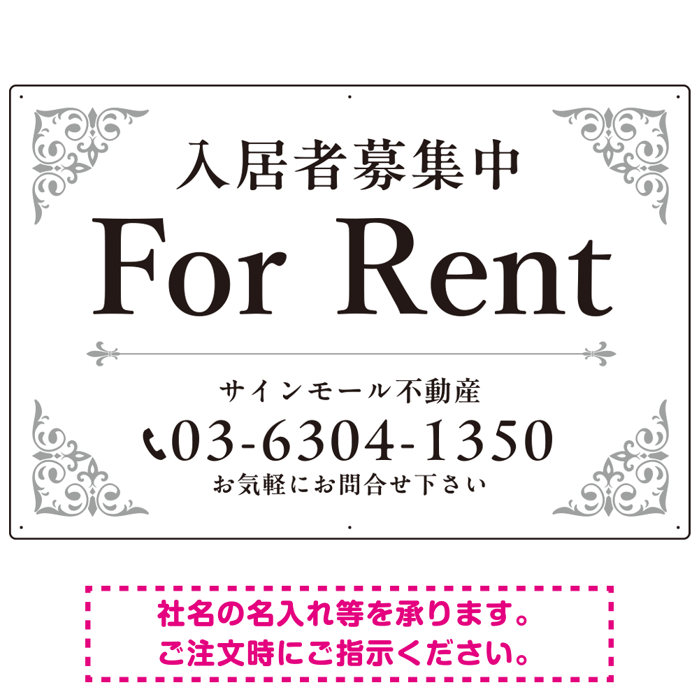 エレガントなコーナーデザイン FOR RENT 入居者募集中 不動産向けデザインプレート看板 ホワイト&シルバー W900×H600 エコユニボード (SP-SMD707B-90x60U)
