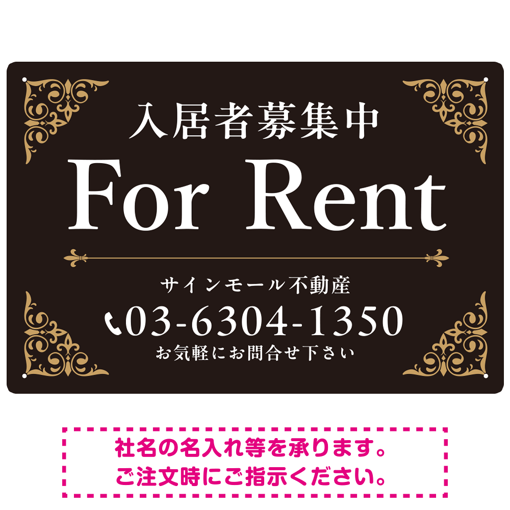 商品説明:エレガントなコーナーデザイン FOR RENT 入居者募集中 不動産向けデザインプレート看板 ブラック&ゴールド W450×H300 エコユニボード (SP-SMD707C-45x30U)