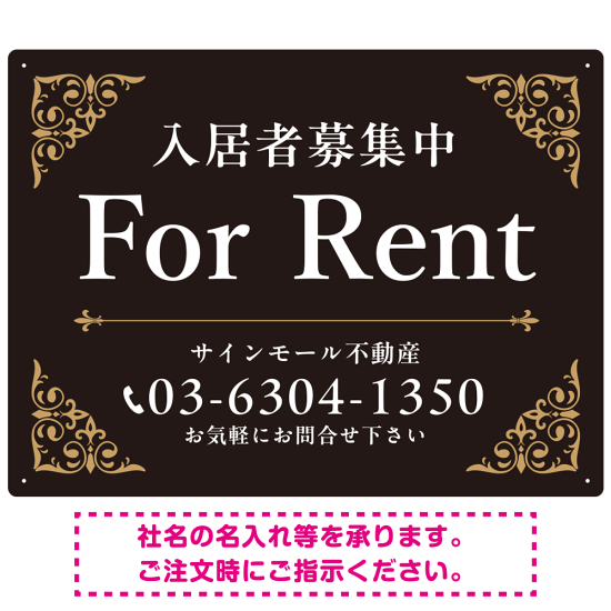 エレガントなコーナーデザイン FOR RENT 入居者募集中 不動産向けデザインプレート看板 ブラック&ゴールド W600×H450 エコユニボード (SP-SMD707C-60x45U)
