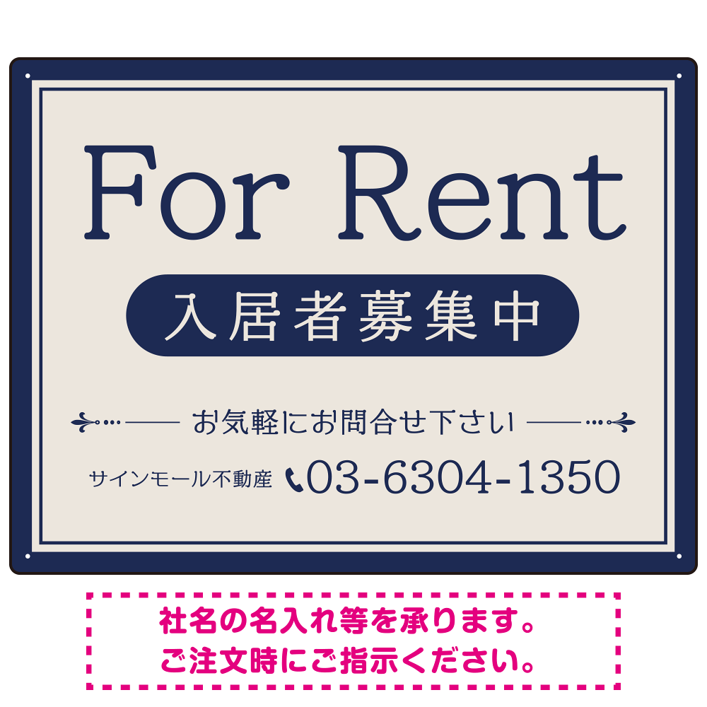商品説明:ベージュとネイビーの落ち着いた配色 不動産向けデザインプレート看板 FOR RENT W600×H450 エコユニボード(SP-SMD711A-60x45U)