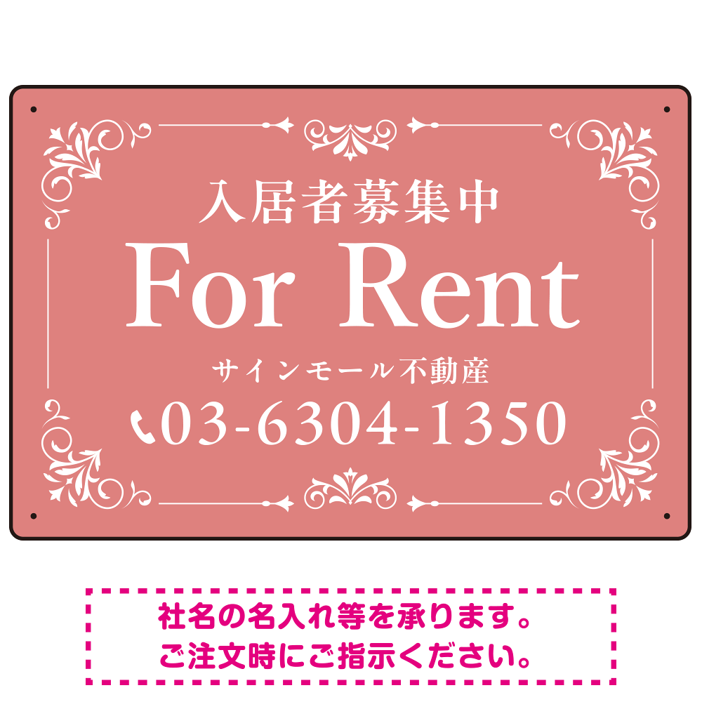 商品説明:柔らかな色合いが魅力の上品デザイン FOR RENT 入居者募集中 不動産向けデザインプレート看板 くすみピンク W450×H300 エコユニボード(SP-SMD712B-45x30U)
