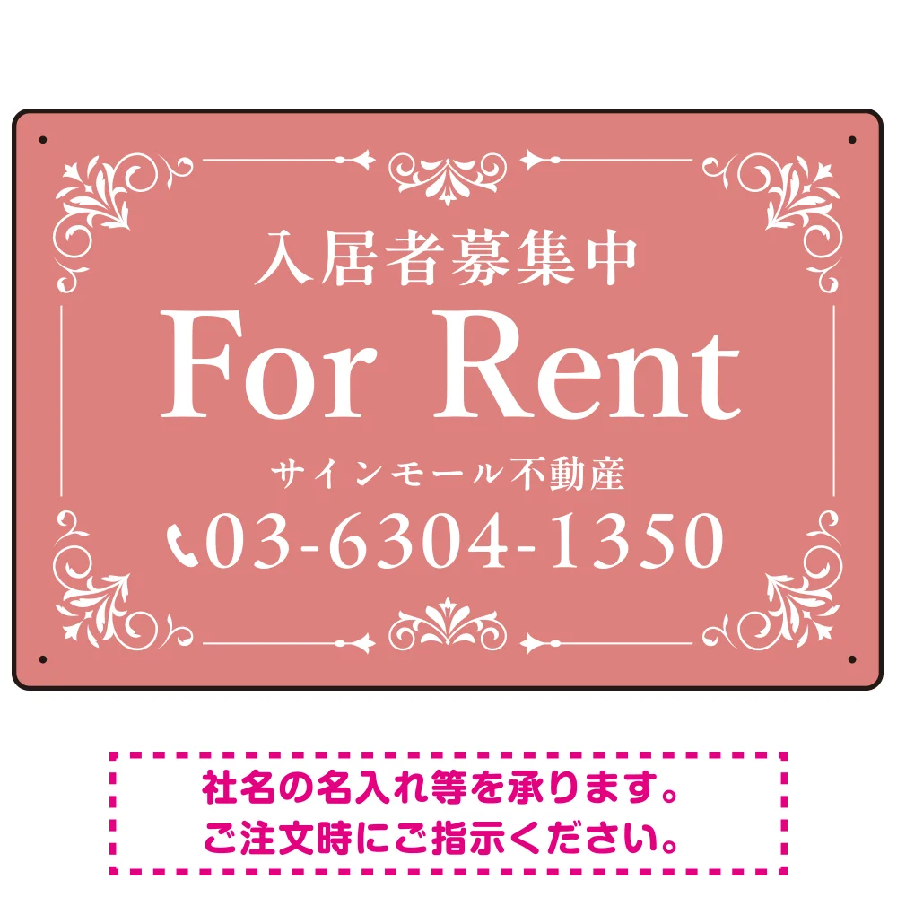 よくある質問:柔らかな色合いが魅力の上品デザイン FOR RENT 入居者募集中 不動産向けデザインプレート看板 くすみピンク W450×H300 エコユニボード(SP-SMD712B-45x30U)