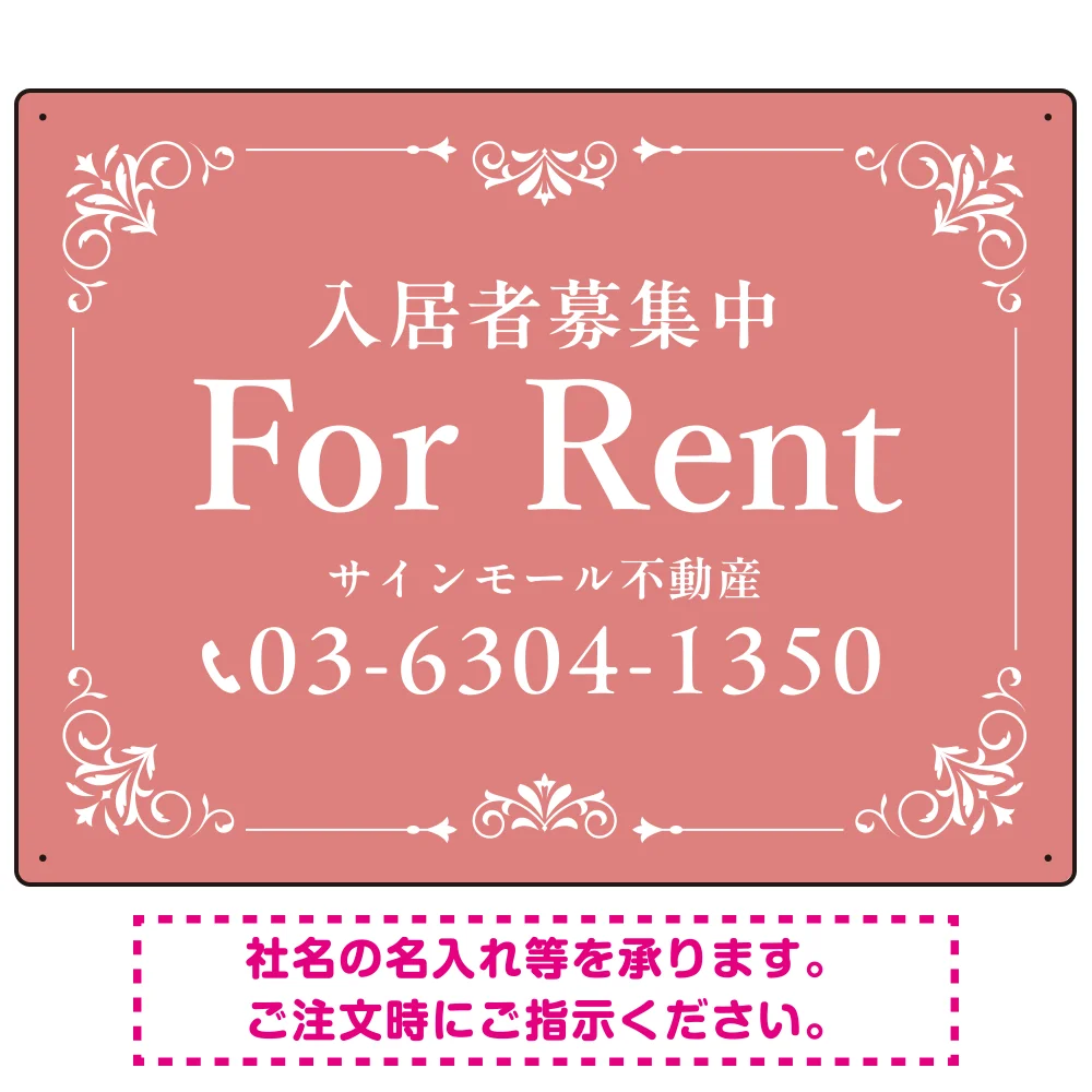 よくある質問:柔らかな色合いが魅力の上品デザイン FOR RENT 入居者募集中 不動産向けデザインプレート看板 くすみピンク W600×H450 エコユニボード(SP-SMD712B-60x45U)