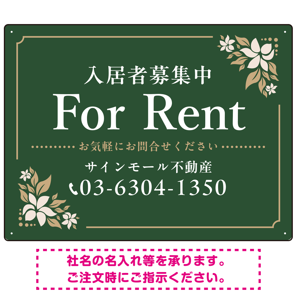 柔らかな花柄モチーフと洗練配色 FOR RENT 入居者募集中 不動産向けデザインプレート看板 グリーン W600×H450 エコユニボード(SP-SMD714B-60x45U)