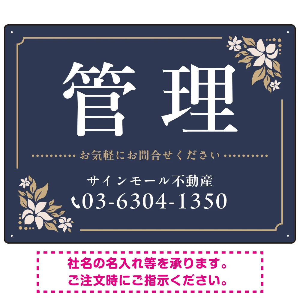 柔らかな花柄モチーフと洗練配色 管理 不動産向けデザインプレート看板 ネイビー W600×H450 エコユニボード(SP-SMD715A-60x45U)